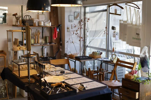 扉を開けた先に広がるのは、店主の確かな審美眼によって選び抜かれたジュエリーや小物たち。什器一つひとつにも店主のこだわりが感じられる店内は、まるで美しい箱庭を覗き込んでいるかのようだ。