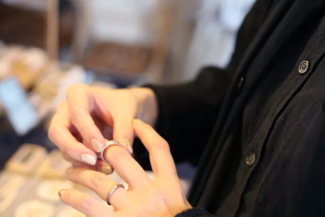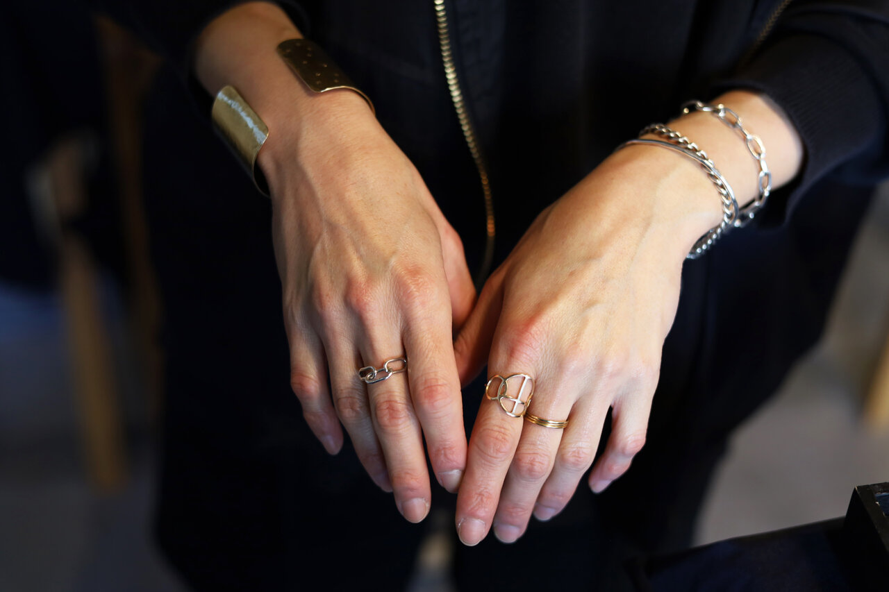 最終的に選んだのは、シルバーのアームに、継ぎ目のような18Kの飾りが施されたリング。太めのアームが存在感を放つデザインは、女性だけでなく男性にも人気だという。