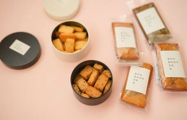 BONBONS DE Kの特徴は、愛らしい見た目と体に良い素材。白砂糖は使わずきび砂糖やはちみつを使い、国産米100%の米粉や北海道産のバターを使った35種類のフィナンシェのほか、クッキーなどの焼き菓子を作っている。