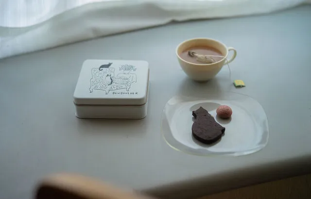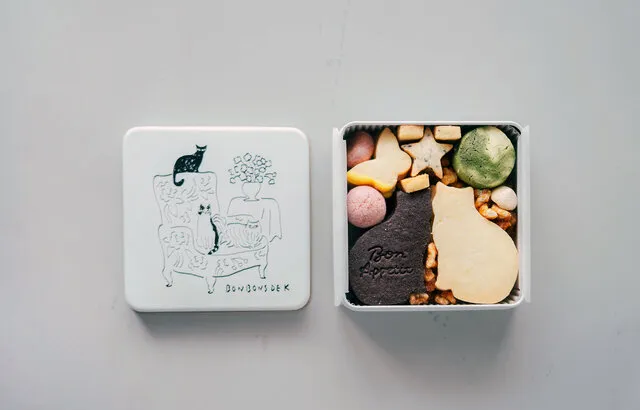おしゃれな猫のイラストの缶を開けると、さらに猫型のクッキー2枚が仲睦まじく向き合うようにして納められている。色もピンクにグリーンとカラフルだから眺めているだけで楽しく、抹茶味やパルメザンバジル、セサミ、キャラメリゼ、フランボワーズなどさまざまなフレーバーを味わうことができる。
