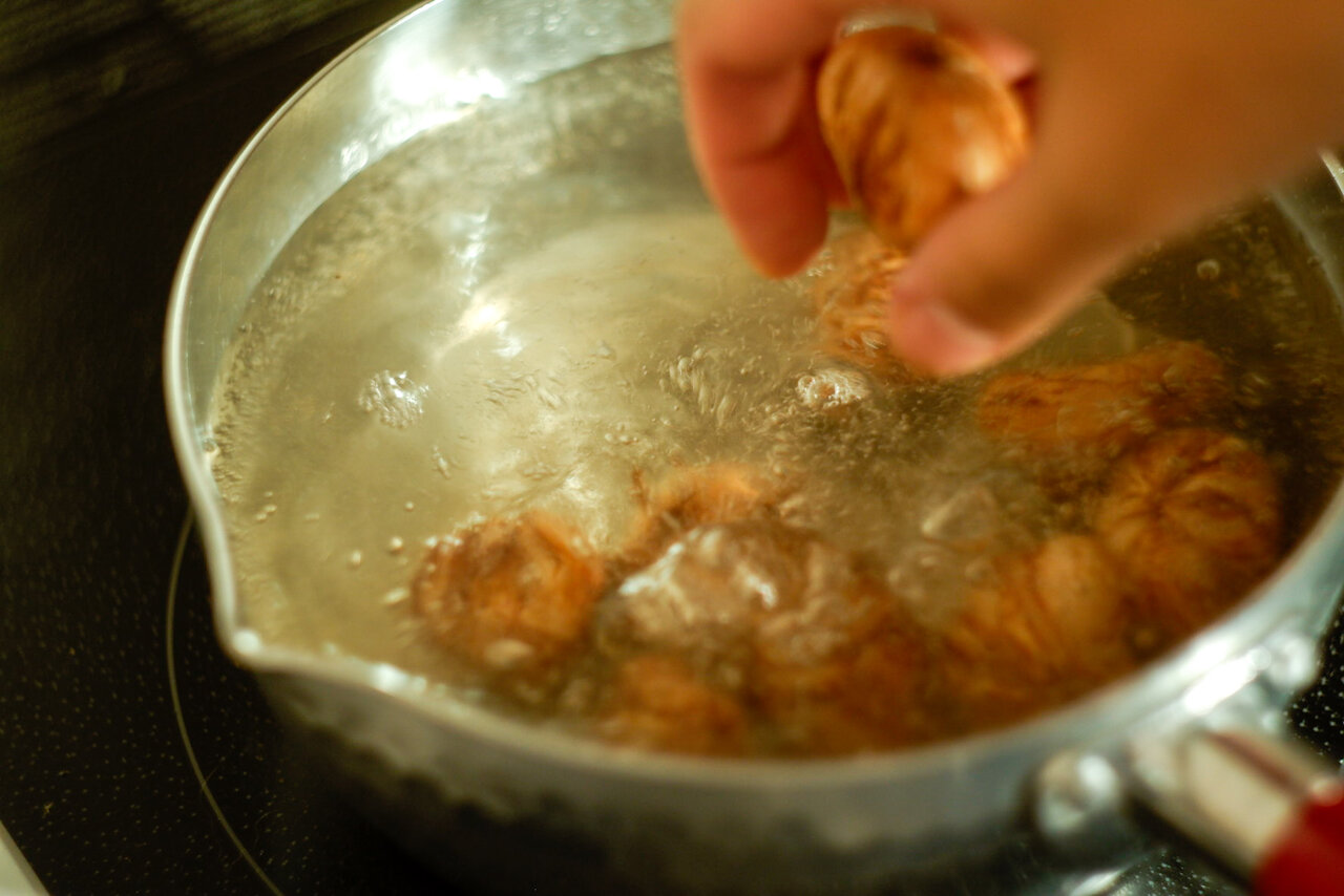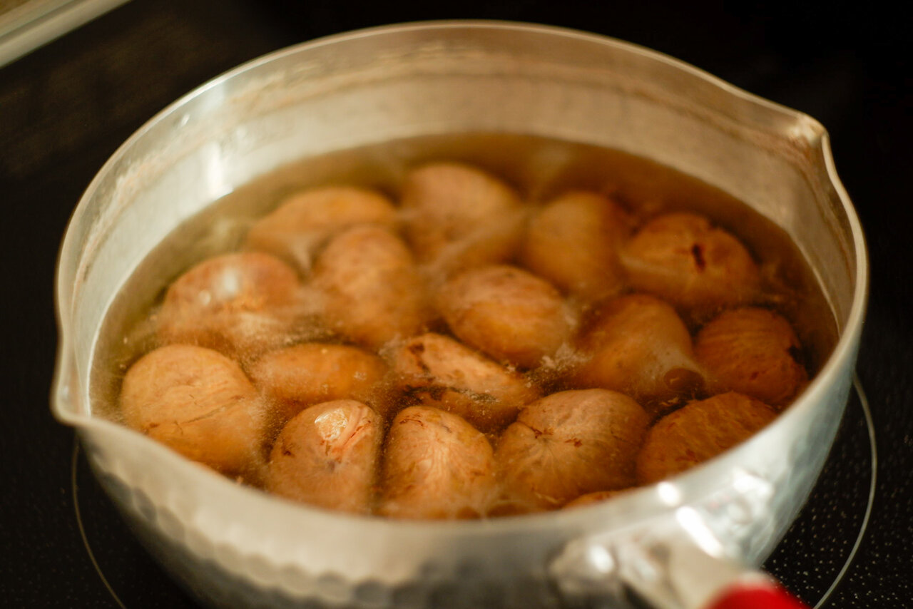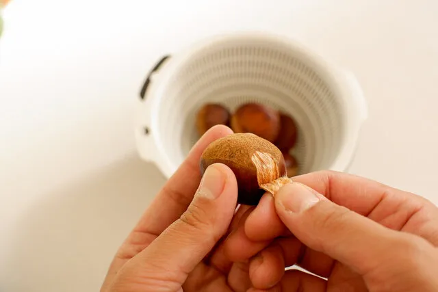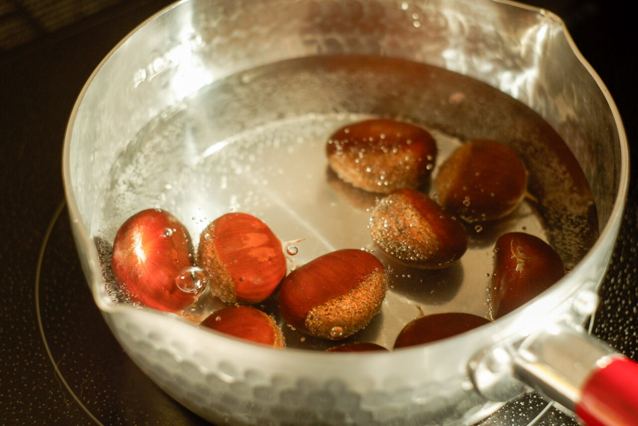 栗を剥く前に一晩水に浸けておくことが一般的だが、今回は時短で熱湯に浸す方法をとる。熱湯を沸かした鍋に栗を入れ5分程浸し、順に取り出しながら皮を剥いていく。この方法なら栗を買ってきてすぐに作り始められる。