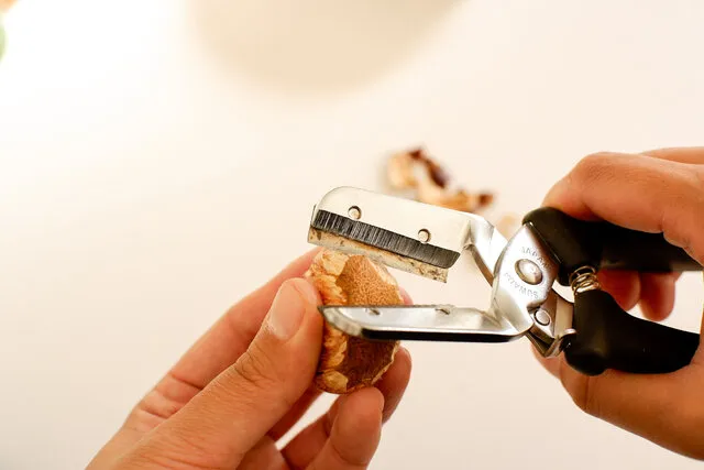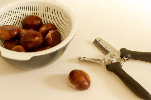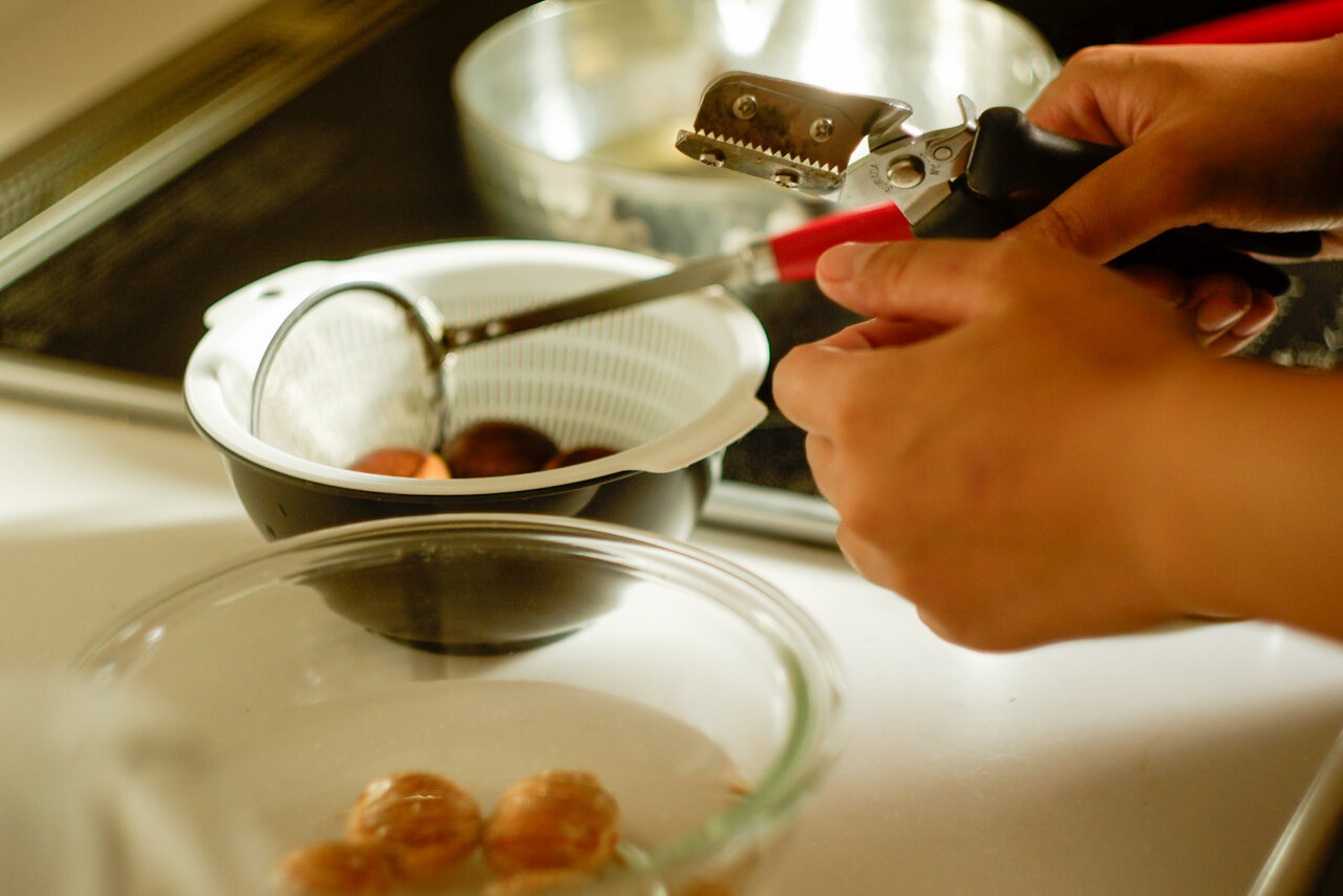 包丁で剥く作業に自信がない人におすすめしたいのが、栗剥き専用のハサミだ。これを使えば比較的作業が楽になるため、大量に仕込む場合にも向いている。筆者は諏訪田製作所の「栗くり坊主」を愛用している。鬼皮と渋皮がいっしょに剥ける優れもので、渋皮を残して剥くこともできる。りんごの皮を剥くようにサクサク切れる。