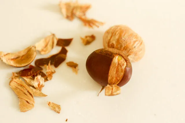 栗の外側の硬い皮を鬼皮という。栗の底の部分に刃を入れ少し削り取り引っ掛かりを作る。そこをきっかけにし再び刃を入れ引っ張り上げるように鬼皮だけを剥いていく。渋皮を傷つけないように慎重に刃を入れる。少しでも傷がついてしまったものは、この後茹でこぼす際に煮崩れてしまうため渋皮煮に使えない。細心の注意を払おう。