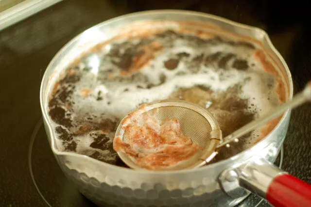 アクをすくい10分ほど経ったらザルに上げて水を切る。すぐに別の鍋で沸かしておいたお湯に入れ10分ほど煮る。この作業を3回前後繰り返す。煮汁が黒っぽく濁った色から透き通った色になれば終了の合図。火から外し水を加えて人肌まで温度を下げる。