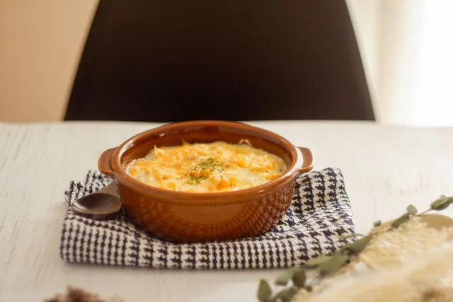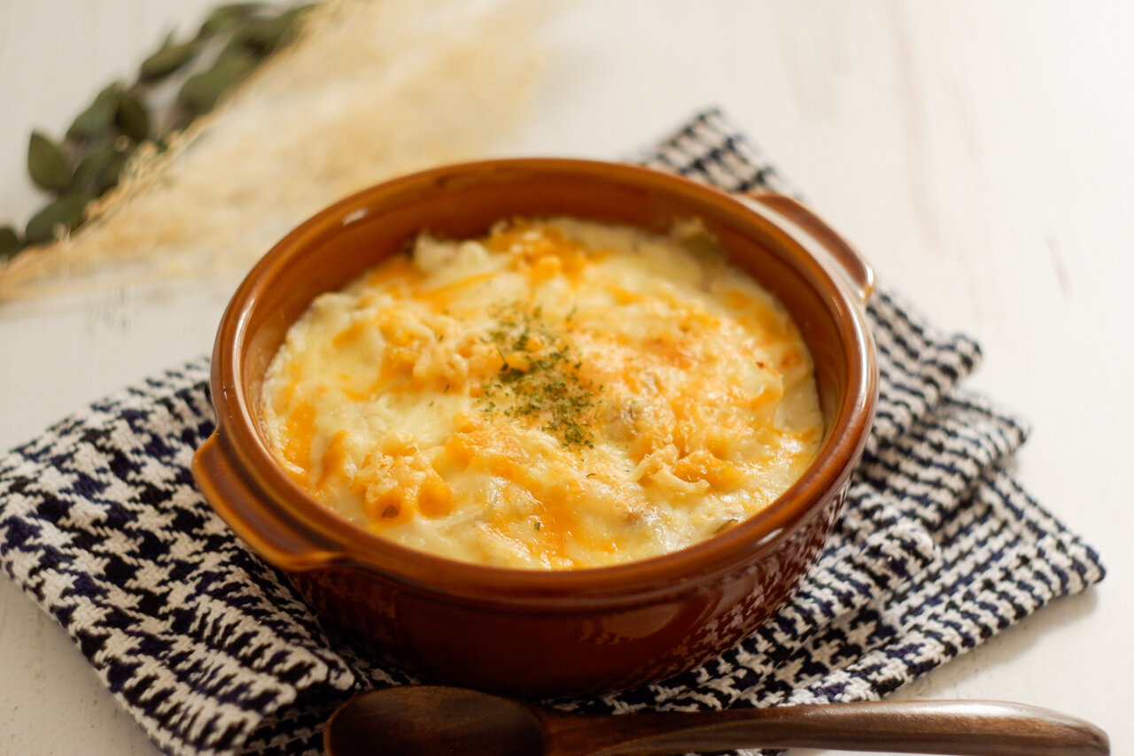 もみじ型のパスタは国産にんじんが練り込まれていて、形も色もこの季節にぴったりだ。茸たっぷりのグラタンに入れれば、食材も見た目も自然の森の実りを感じられる一品に。