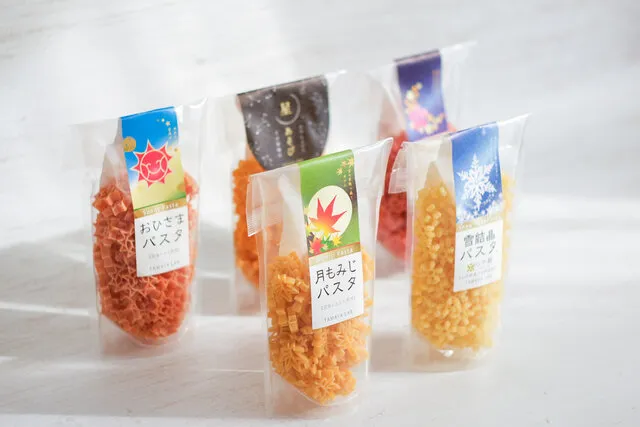 山形の霊峰月山の麓にある玉谷製麺所は、豊富な水資源と職人の技術で70年以上麺づくりを続けてきた老舗製麺所である。お客様の声からはじまったというアートパスタは、日本国内のみならず海外での需要も高い。雪結晶、桜、星、もみじなど、その形も色も多種多様で私たちの目を楽しませてくれる。研究と改良を重ね完成したパスタは細部まで美しく、それでいて非常に鮮やかだ。