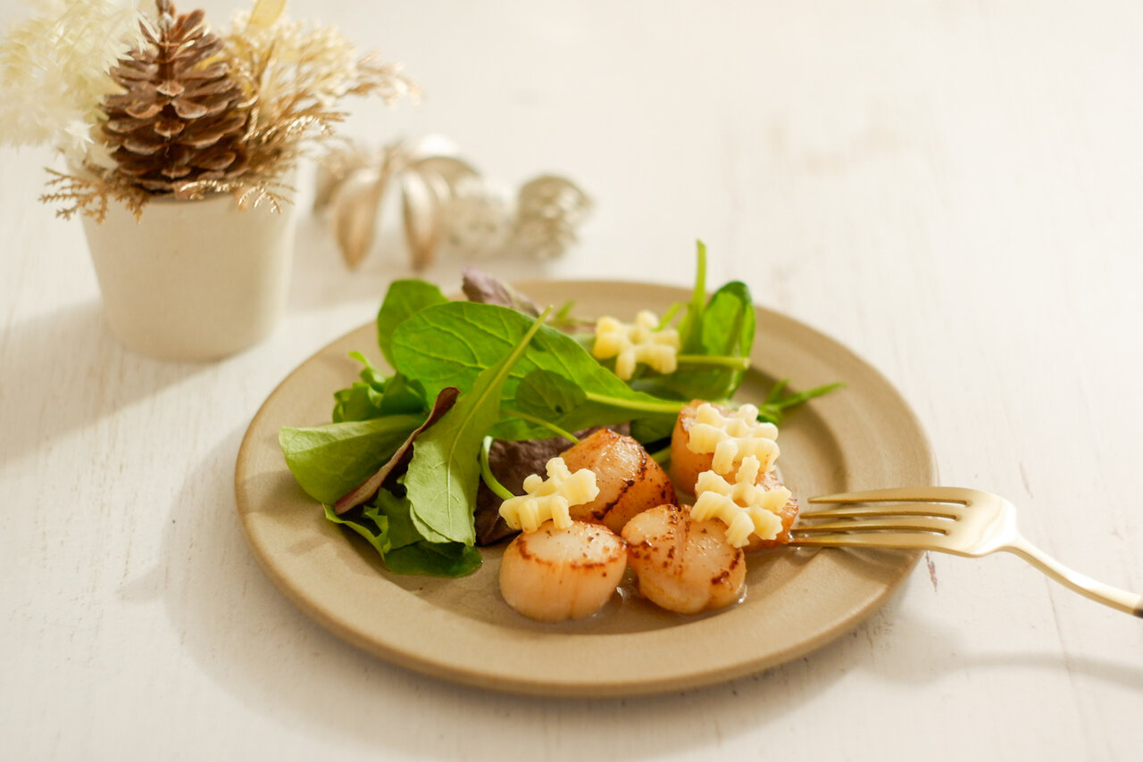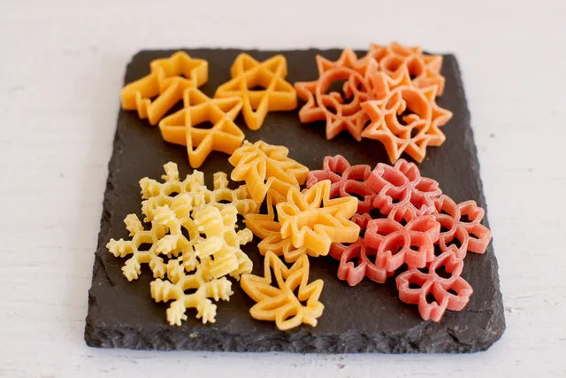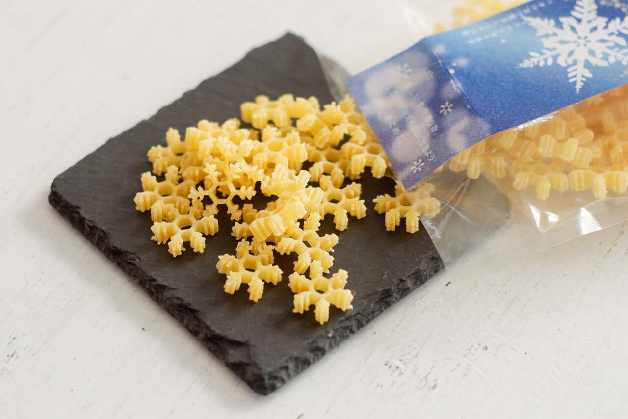 まさにこれからの季節に活躍してくれる雪の結晶の形のパスタは、ホタテのソテーやクリームシチューなどをほっこりとしたやさしい印象に仕上げよう。あえて白に白を合わせることで、雪結晶の形が際立ってより一層冬らしい一皿になる。逆に赤や緑の野菜を使えば、ホリデーシーズンのパーティー料理にも一花を添えてくれるだろう。