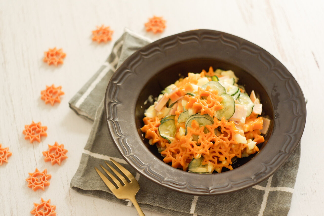 国産トマトが練り込まれた赤みが強いおひさまパスタは、サラダのメインとして使って彩りと華やかさをプラスしよう。グリーンカラーの野菜とのコントラストが食卓をビビットに彩ってくれる。他の食材に頼っていた彩りも、パスタ自体が鮮やかなことで一層華やかさを増す。