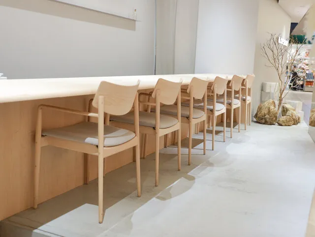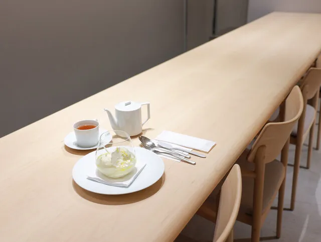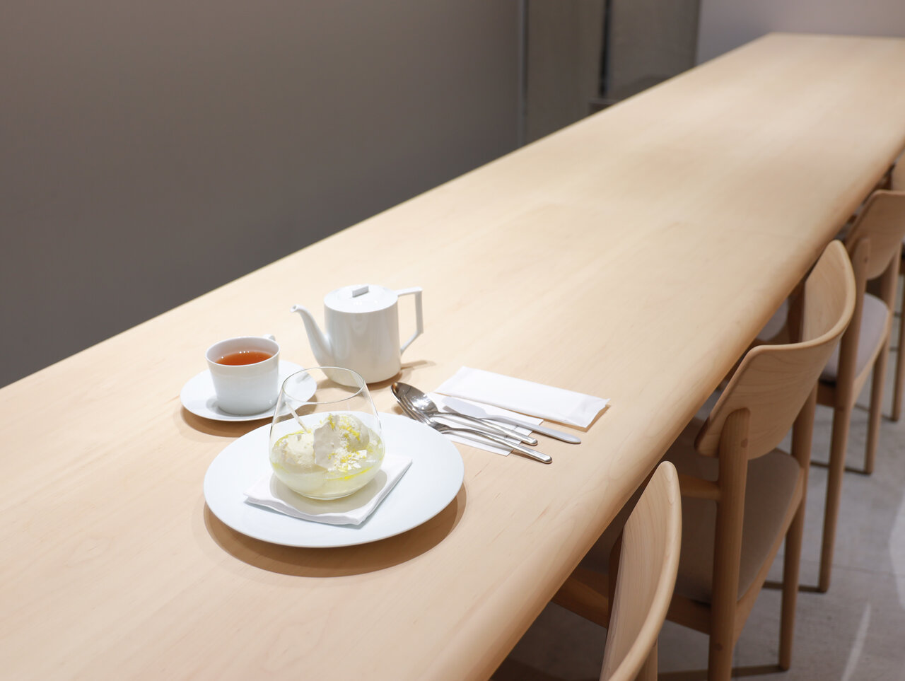「Mr. CHEESECAKE GINZA SIX店」には、6席のみのカウンター席が併設されている。グレーを基調にした柔らかなトーンで統一された空間に身を置くと、自然とミスチの世界観へと引き込まれる。カウンター席でありながら、椅子はゆったりと身体を預けられる造り。銀座の中心にいることを忘れさせる、穏やかで心ほどける時間が訪れる。