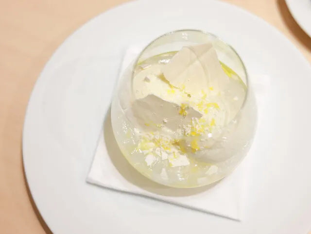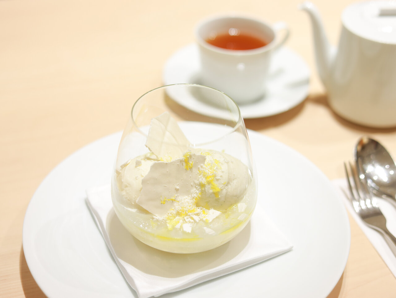 グラスの底には、レモンとハーブの爽やかなジュレが。その上に重なるのは、キャラメリゼしたクッキーをバニラに混ぜ込んだディプロマットクリーム。トンカ豆は、ぷるふわ食感のブランマンジェ仕立てに。さらにヨーグルトとクリームチーズのアイスクリームが全体をまとめ上げ、チーズケーキを思わせる味わいを残しながら、冷たく爽やかで、儚さが駆け抜けるような美味しさに仕上げている。