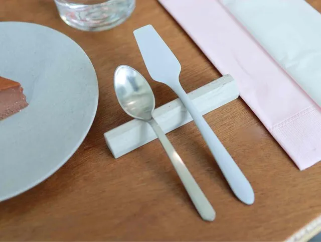 まず、カウンター席では、チーズケーキをストレスなく味わえるよう、薄さや角度にこだわって独自に設計・開発されたチーズケーキ専用スプーンが用意されている。ひと口ごとのなめらかさを引き出すための、さりげない配慮がある。