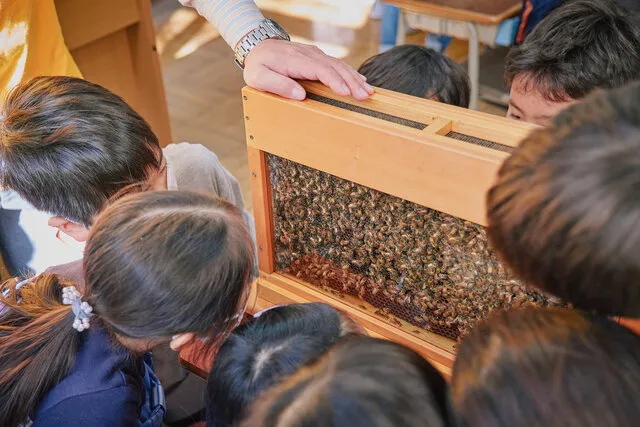 1つ目は、教育機関を中心に展開している環境教育だ。ミツバチを題材にした体験型プログラムを行い、小学校への取り組みでは、フランスの化粧品ブランド、ゲランと連携している。ガラスケースに入れたミツバチを観察したり、養蜂道具に触れたり、はちみつをテイスティングしたりして、五感で学ぶ機会を提供している。