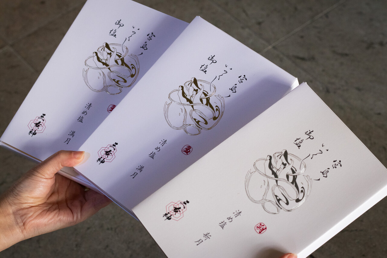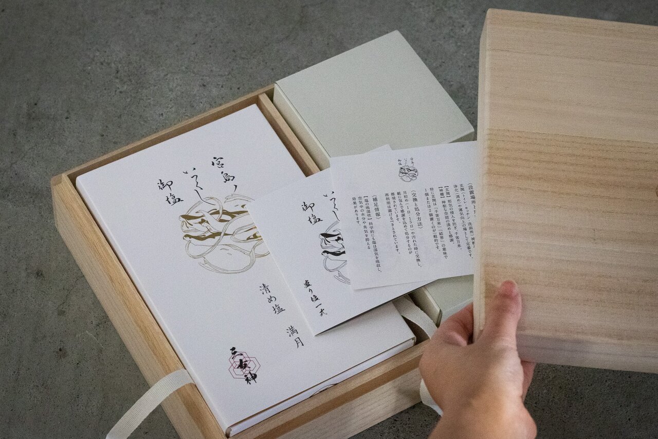 セットには、宮島の海水を月のリズムに合わせて炊き上げた、「満月」と「新月」をテーマにした2種類の塩が用意されている。月の満ち欠けは、海の満ち引きと深く関わっているためだ。満月の塩には「引き寄せと調和」、新月の塩には「浄化やリセット」の意味が込められているという。そのときの気分に合わせて、好みの塩を選んでみよう。