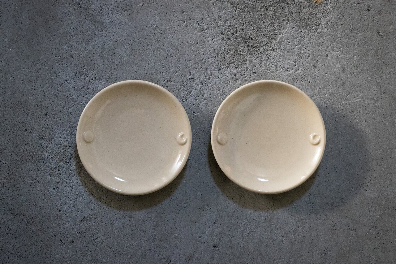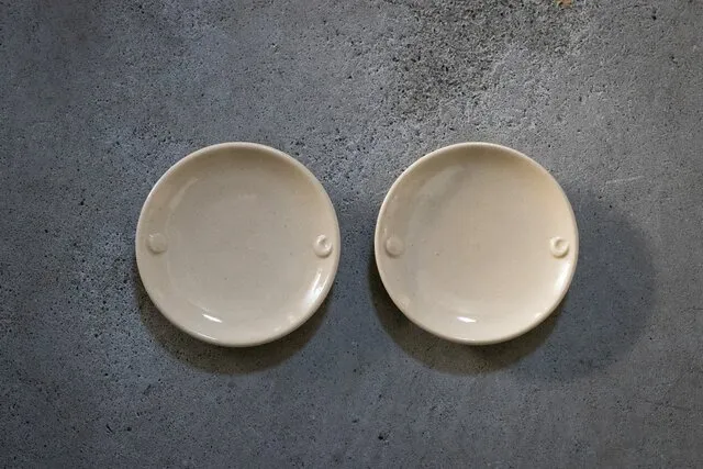 塩をのせる盛り皿は、対厳堂の3代目 山根 興哉氏が手がける。嚴島神社にて祈祷を受けた本殿下の「御砂」を混ぜて焼き上げる伝統技法が用いられている 。器の両サイドには、大鳥居にも刻まれている「太陽」と「月」のモチーフがあしらわれ、宮島らしさが表現されている 。