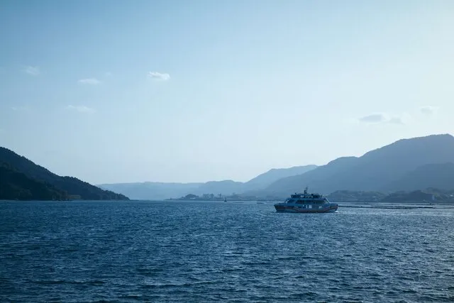 宮島へ向かう際、まず船の上から見える大鳥居の姿が強く印象に残った。鳥居の上の部分(笠木)には、西側に三日月、東側に太陽の形をした飾りがつけられている。