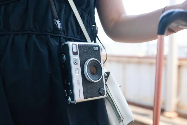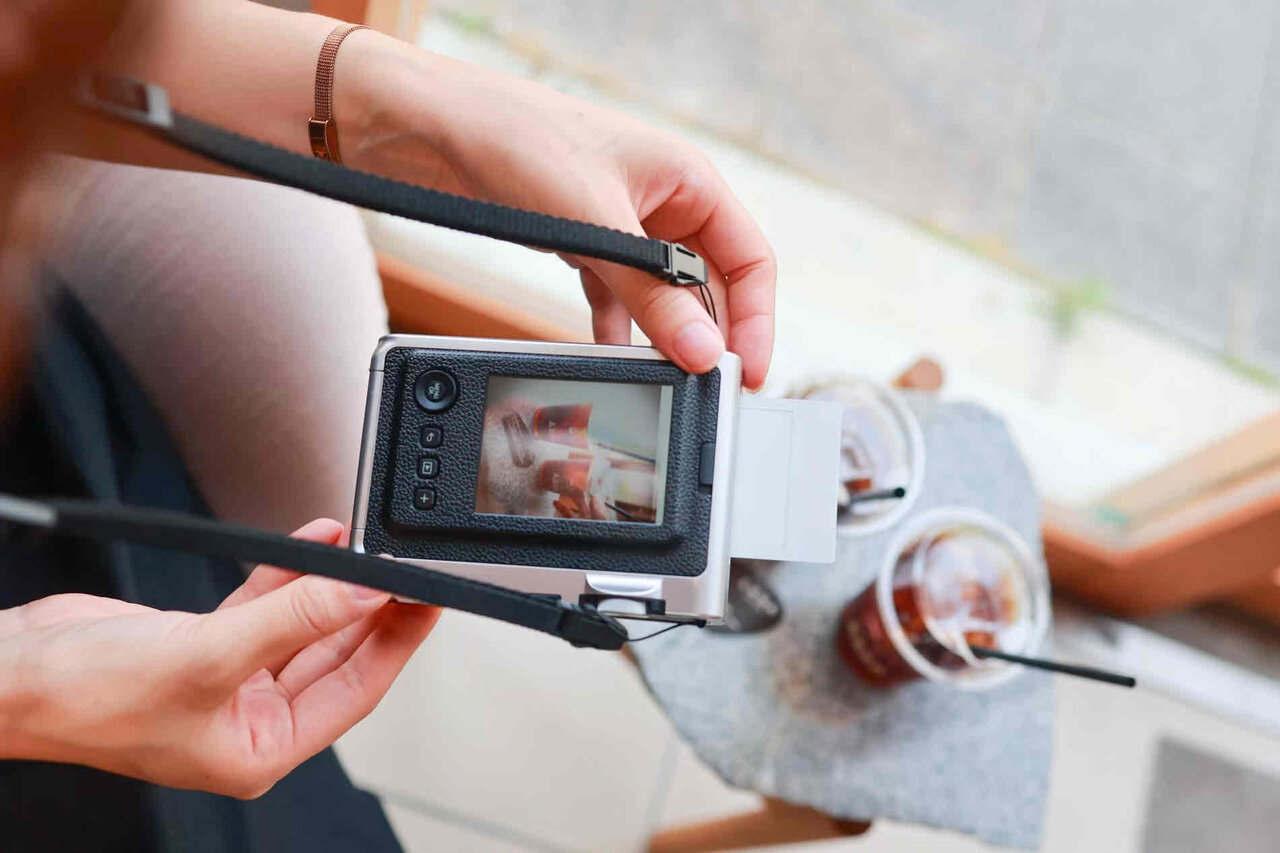 「instax mini Evo™(チェキ)」の魅力は、撮影機能や画質のみにとどまらない。大きく2種類の素材の組み合わせで作られた細部まで上品なディティールでありながら、手に取った瞬間、その軽さとコンパクトさのギャップに驚く。首から下げて鏡をのぞけば、レトロでかわいらしい佇まいがアクセサリーのように映り、持ち歩くだけで気分が上がる。