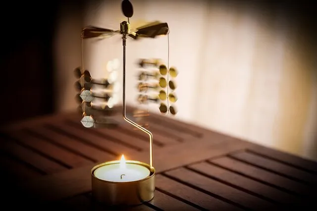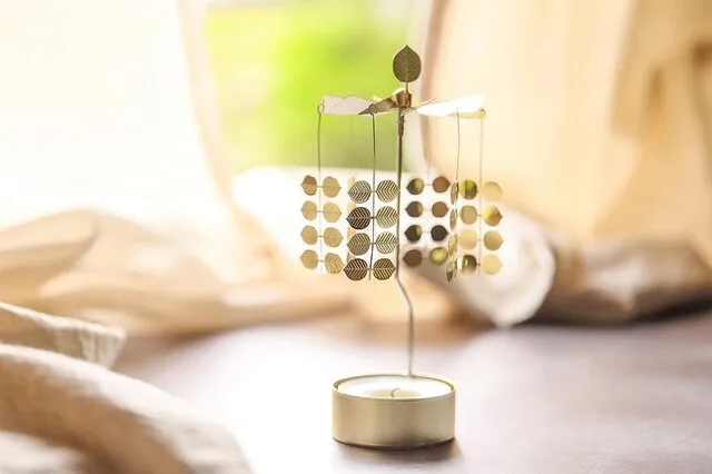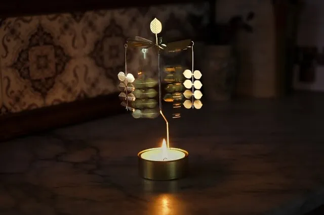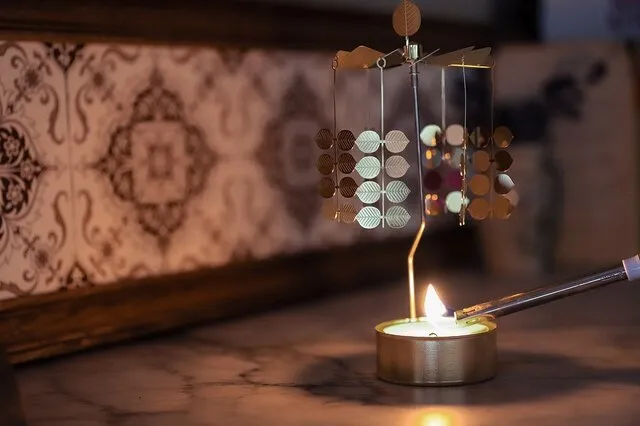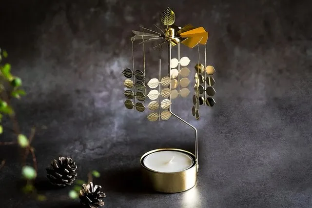 このロータリーキャンドルホルダーはキャンドルに火を灯すと炎の熱で空気が軽くなり、上へ移動する上昇気流が起きて、タービンと呼ばれるホルダー上部のファンと、それに付けた飾りがくるくると回る構造となっている。