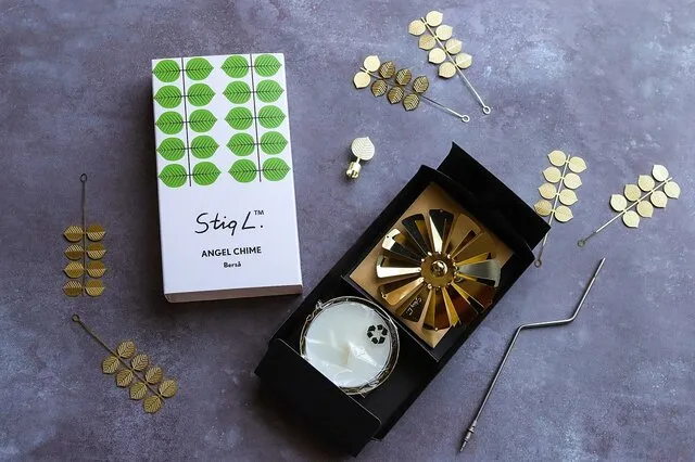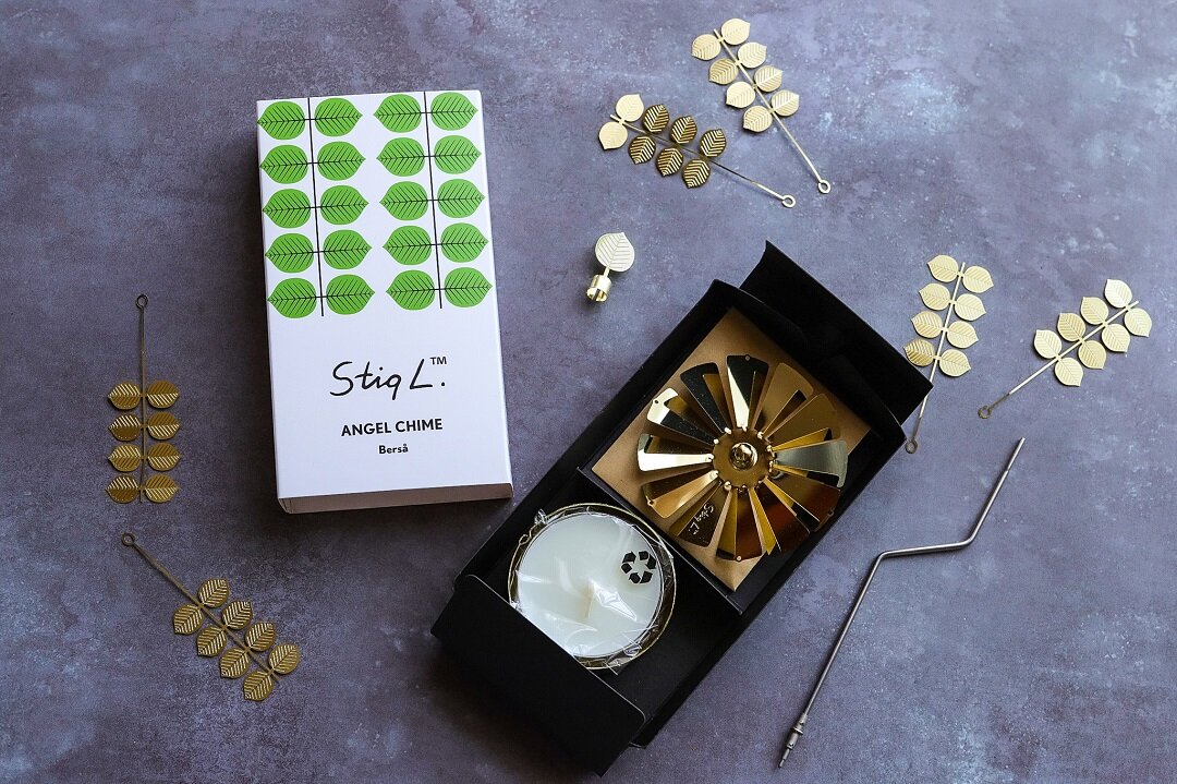 ロータリーキャンドルホルダー・ベルサはスティグ・リンドベリのデザインが美しいボックスに収められている。内部にはキャンドルとキャンドルカップ、タービンと呼ばれるファン、それを支えるバー、そしてファンに取り付ける装飾が付属している。