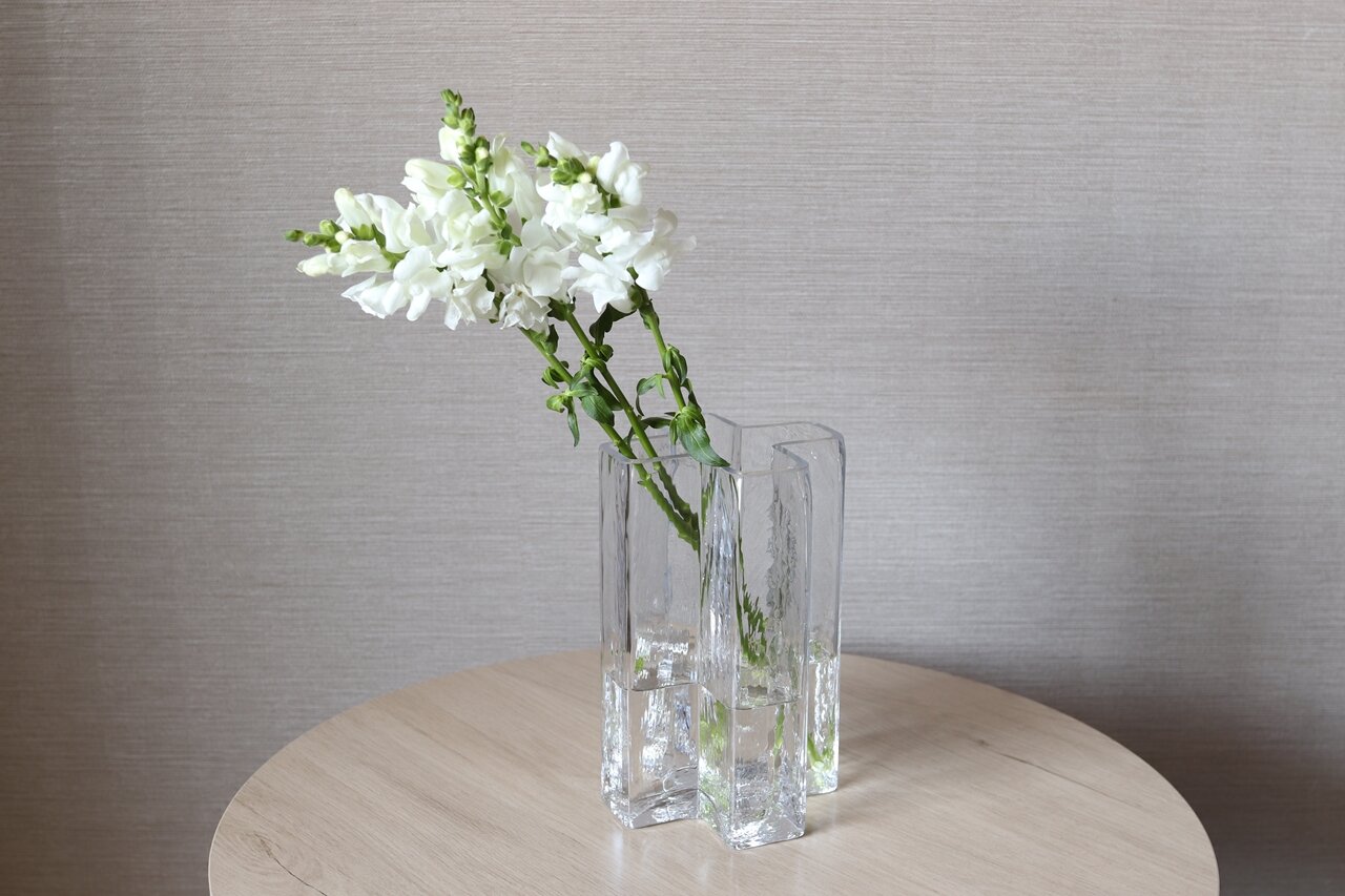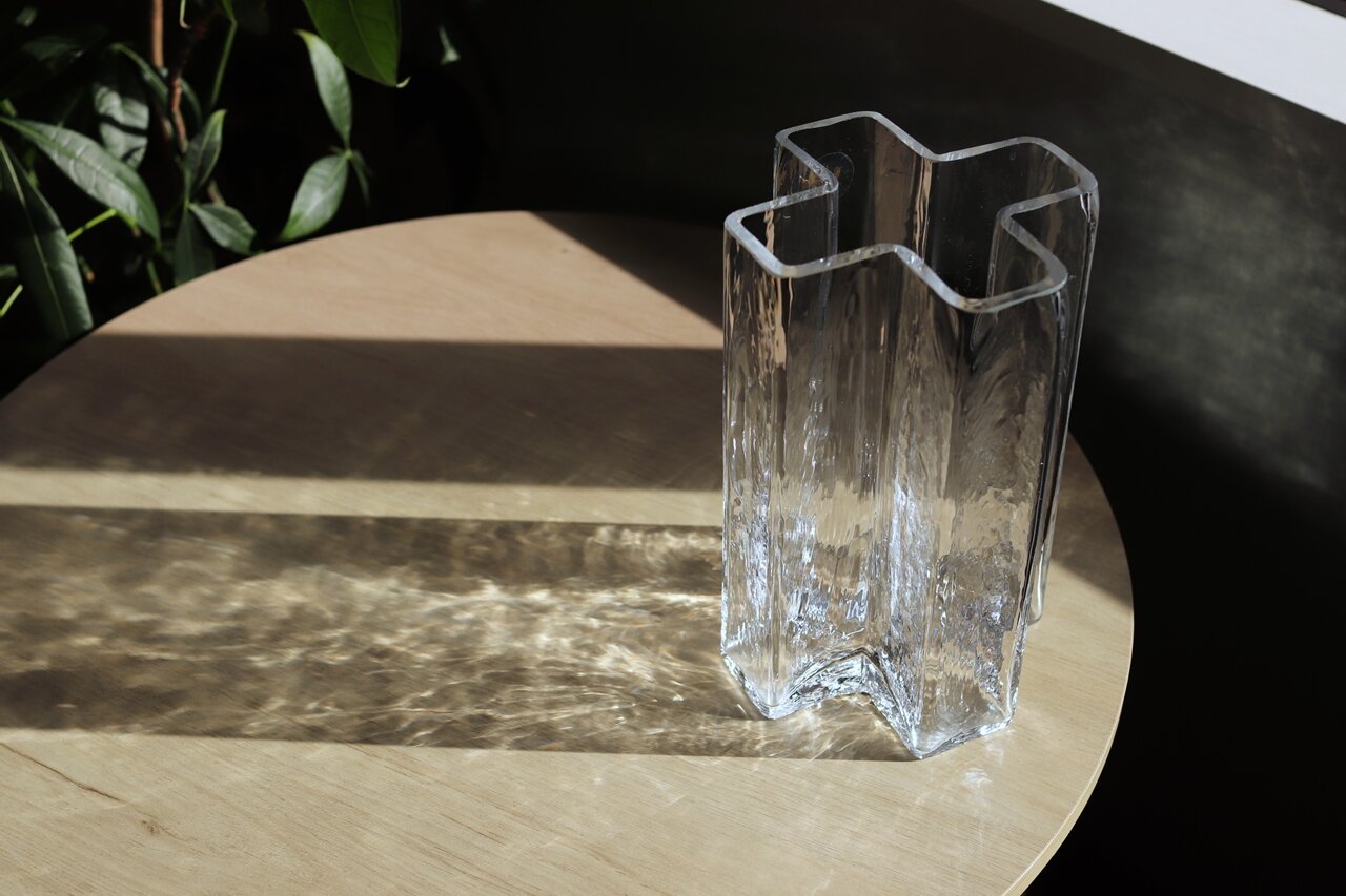 クロスベースは断面が十字型になっためずらしい形状の花器。まるで氷の柱のような独特の表面加工はガラスならではの美しさが際立ち、光が当たったときに映し出す影もゆらぎがあって魅力的だ。光の角度によって影の印象も変化するため、毎日見ていても飽きないデザイン。花や水を入れずに置いておくだけでもインテリアアイテムとして存在感を放っている。