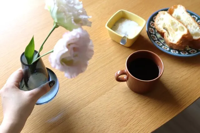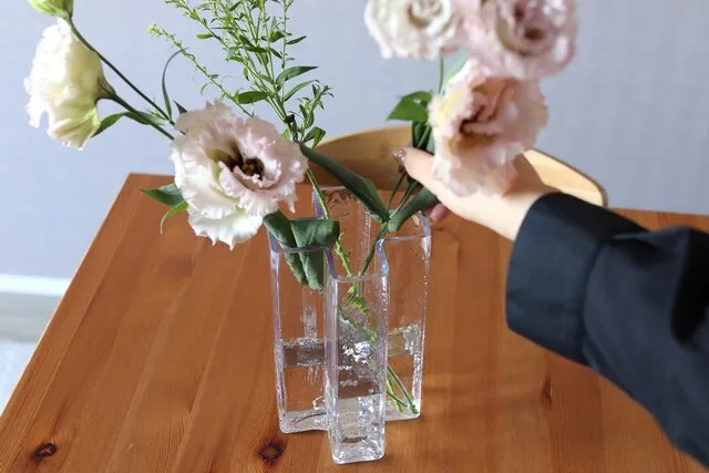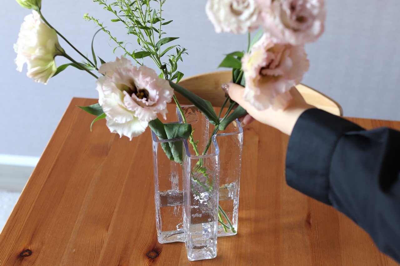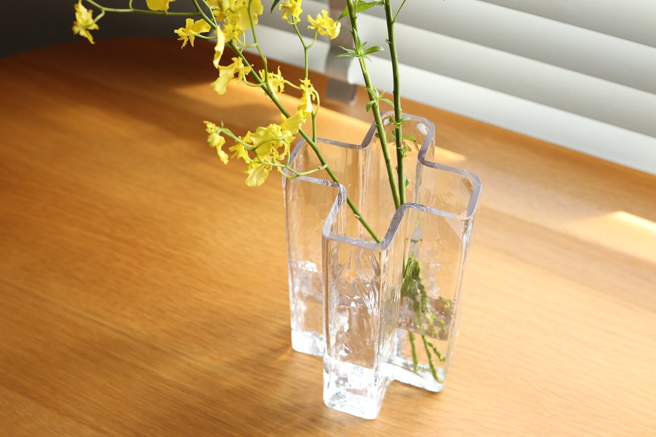 また、花の茎が長いときはクロスベースに、手入れして短くなったらフローラベースにといったように、それぞれを使い分けることで花を長く楽しむことができる。この北欧らしい機能美が詰まった2つの花器を使い、花をもっと気軽に楽しめる暮らしにしていきたい。