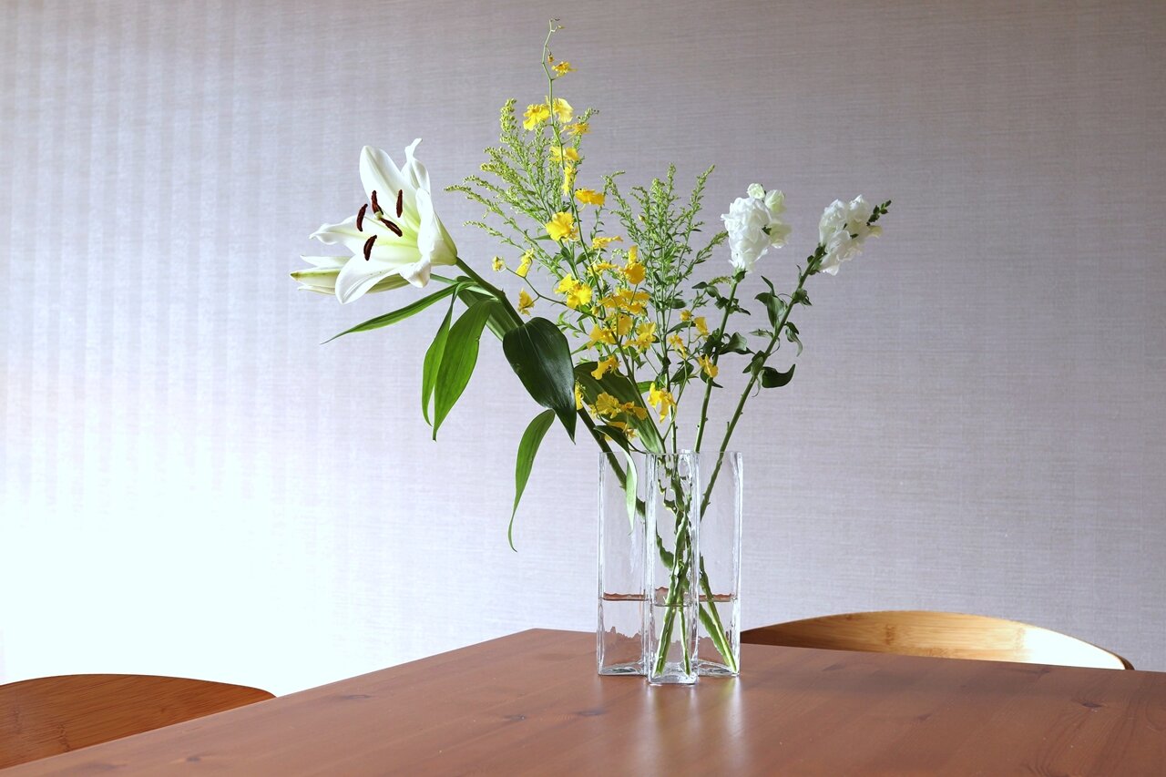 このようにクロスベースとフローラベースの2つが異なる役割を担うことで、切り花を長く生けられる上に魅せ方の幅が広がっていく。せっかくのきれいな切り花をより楽しむために、この2つの花器が多いに活躍してくれている。