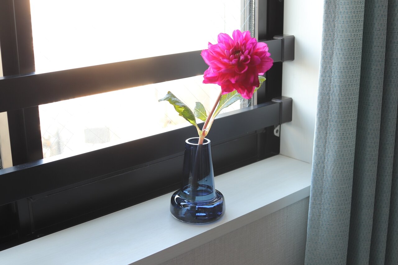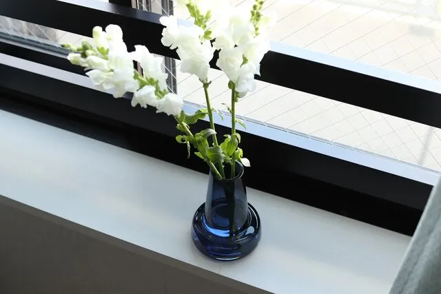 窓際や玄関など、ちょっとしたスペースにも季節の花を取り入れて楽しめるのが魅力だ。また、窓際に置くことでガラスが光に透けるため、ダークブルーの色を際立たせてくれる。主張しすぎないカラーのためどんな花の色ともあわせやすく、花の鮮やかさを引き立たせてくれる。