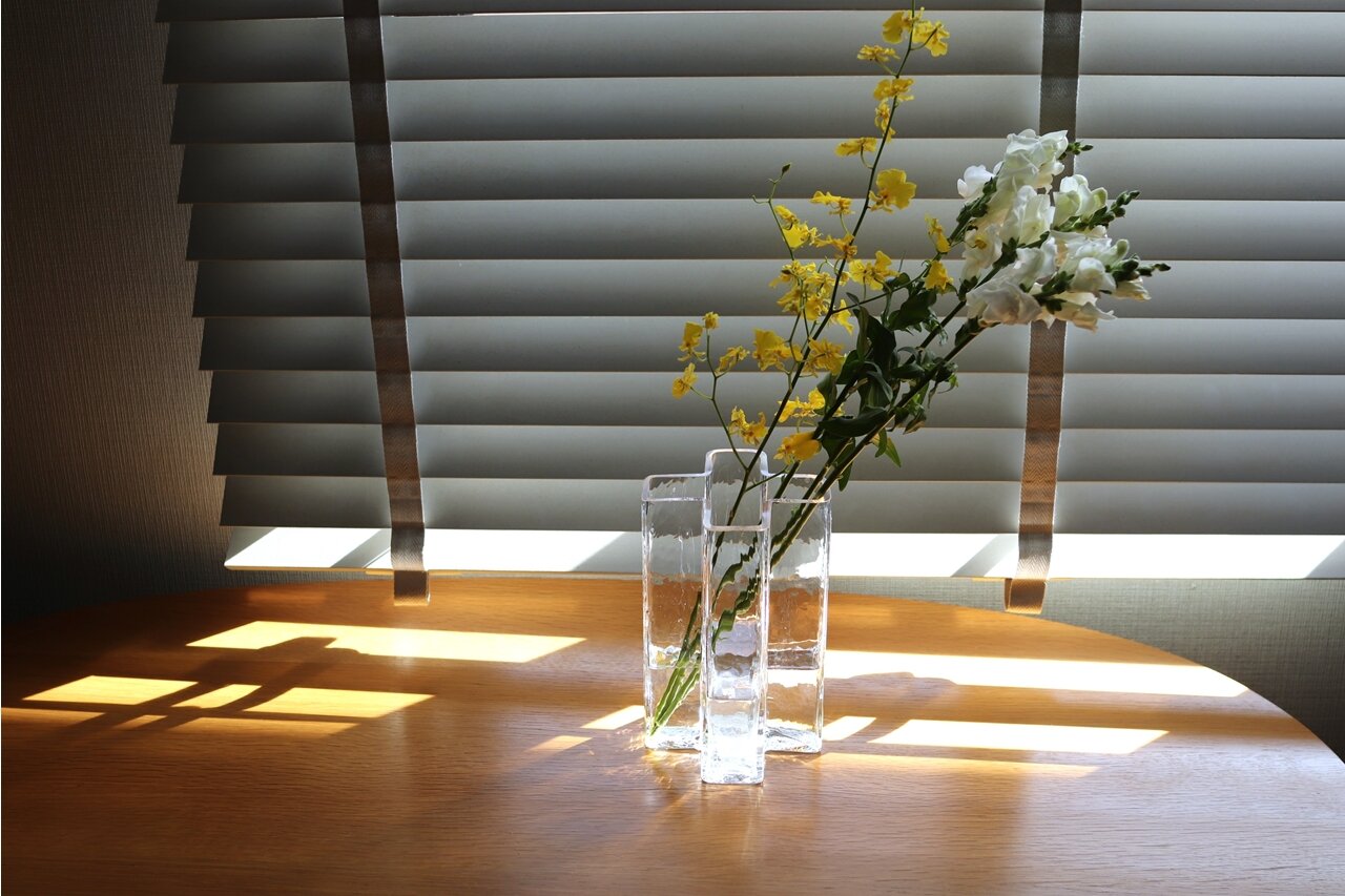 そして花を生けるときは、このガラスの素材感によって中の水をきらきらと見せてくれる。清潔感が感じられて花はより生き生きとした印象に。生花ならではのフレッシュな雰囲気を空間に取り入れやすくなって、普段の暮らしを明るい気分にさせてくれる。