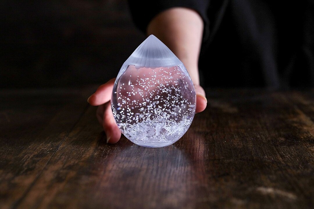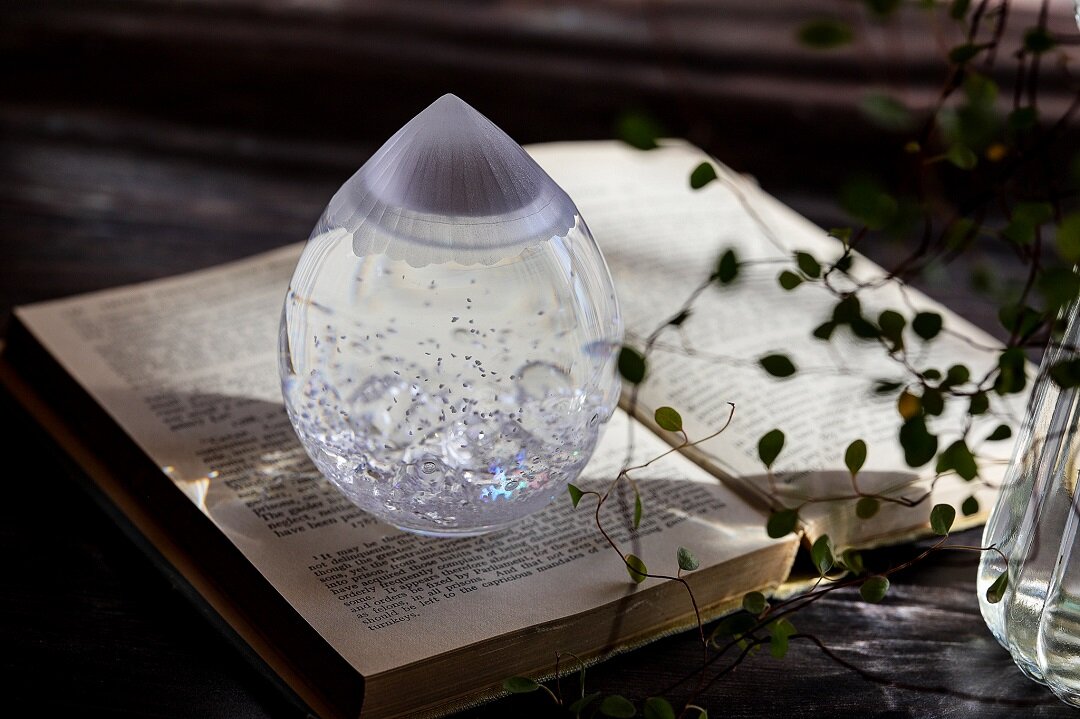 スノードームを手に持って、ガラスを優しく上下に振るとパウダーが雪のようにひらひらと舞い落ちて、その中で儚げなラメが優しく揺れ動く。トップの部分はざっくりと削られて白い曇りガラス状になっており、雪をふんわりと覆っているかのような風情だ。
