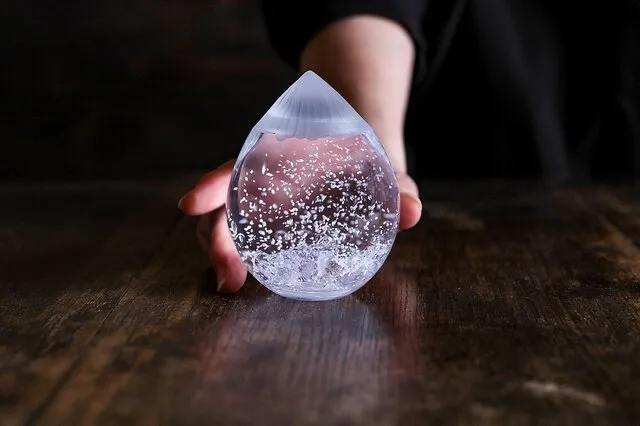 従来のスノードームはガラスの下に台座が付いており、主役となるオブジェがガラス内部に収められているが、アベリョウコ氏の”White Snow”はしずく型のガラスの中に白く繊細なパウダーと細かなラメ、そして雪結晶型のホログラム、きらきらと輝く氷のようなガラスのかけらが収められている。