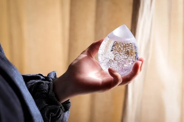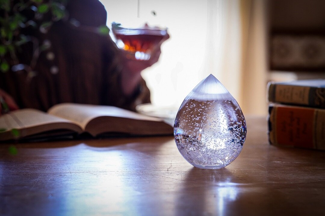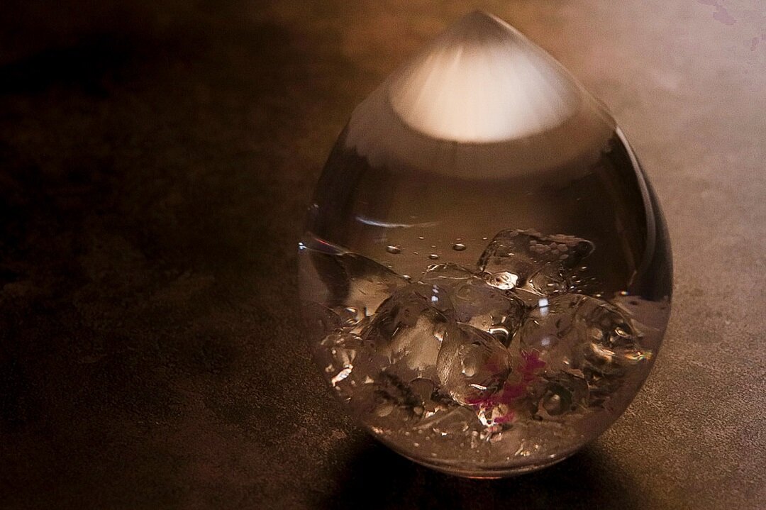 手に持ちガラス内部の変化を楽しむのも良し、ディスプレイとして飾り棚に置いてあるのを眺めるのも良い。またグリーンのそばに置けば凛としたコントラストを描き出し、また窓辺に置いて光が浸透する様はガラス素材だからこそ味わえる美しさだ。