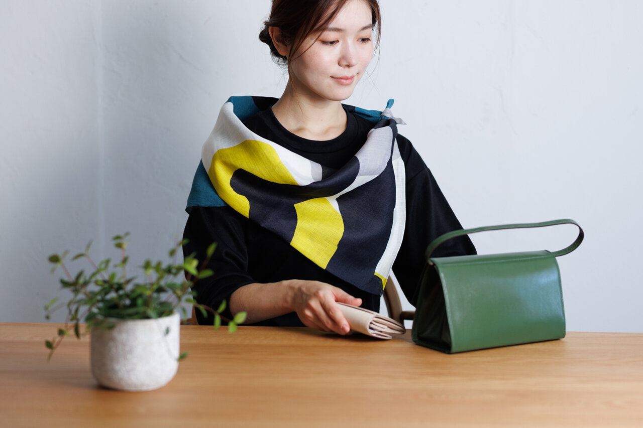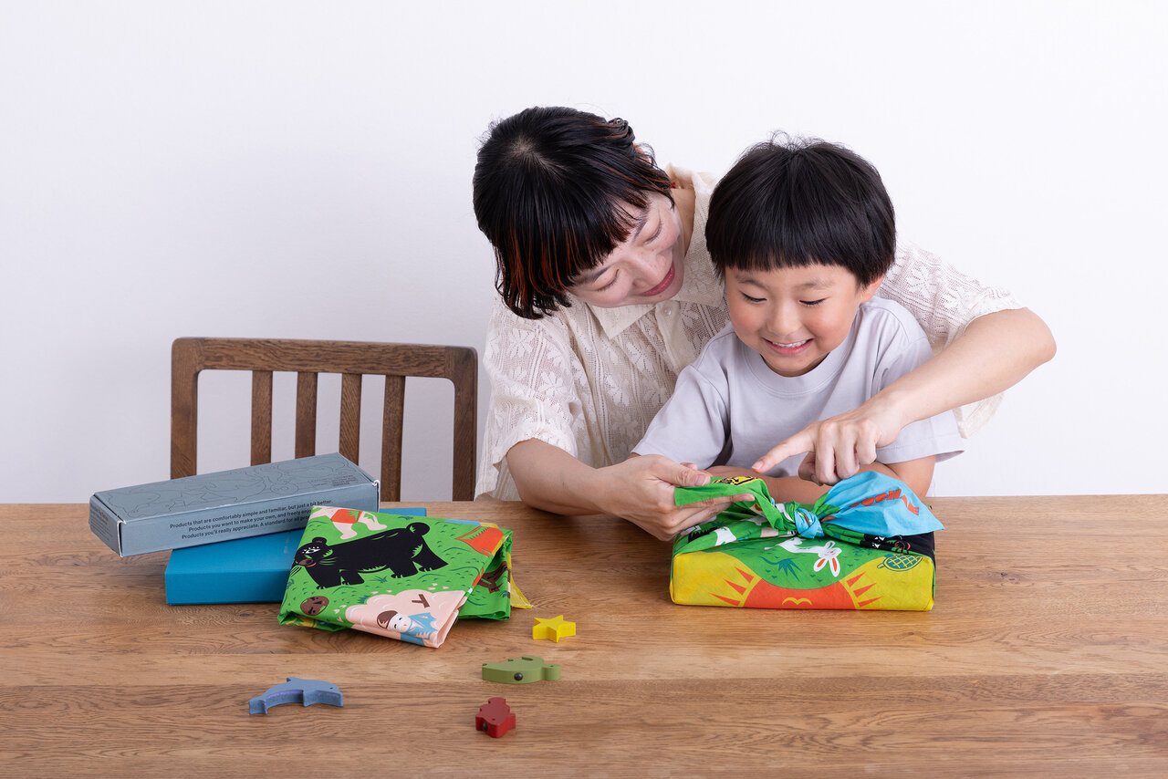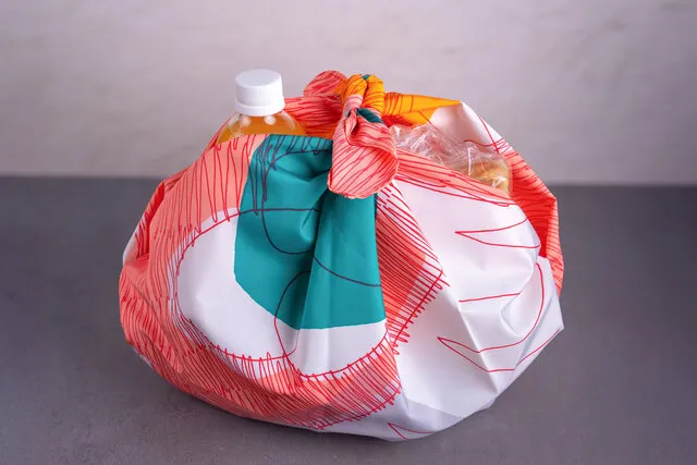 ふろしきは、平面で見るときと、実際に包んで立体になったときとで、デザインの見え方が大きく異なる。開発チームやコラボレーションするクリエイターたちは、その両方を意識しながら、柄のバランスや構図を組み立てている。さまざまな包み方、あるいはストールや膝掛けとして包まない使い方を試してみて、柄の出方の違いを楽しんでみるのも良いだろう。