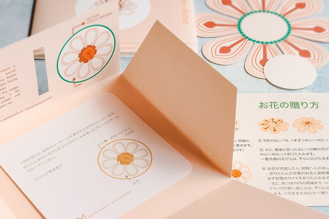 だが言葉を贈る相手を考えカードを選び、綴る言葉を考えるという、親密な時間までもが効率さの前に消えてしまったかのようにも感じる。Jurianne Matter のマジックフラワーは、書く側にも、受け取る側にも「ちょうどいい」距離感を提案する体験型のグリーティングカード。「書く」ハードルを下げ、受け取る側に重みを感じさせることもない。