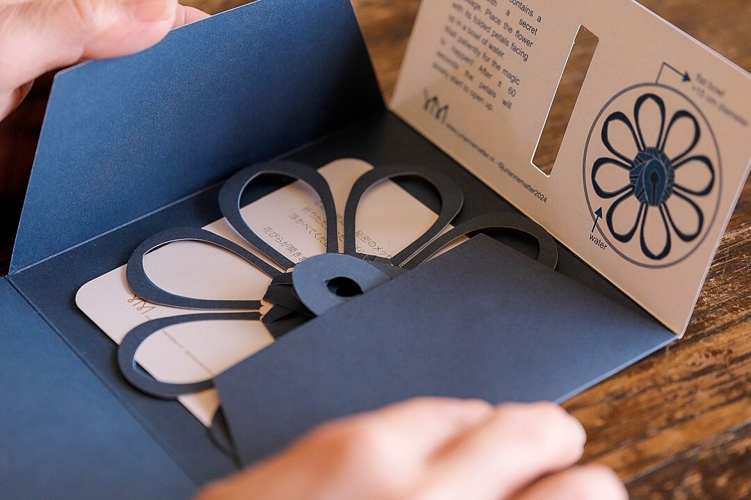カードの中に収められた言葉は短くシンプルなもの。けれど水の上で紙の花が開くという新鮮な体験とともに刻まれたその想いは、長い文章やデジタルの言葉よりも記憶の中に浸透していくに違いない。