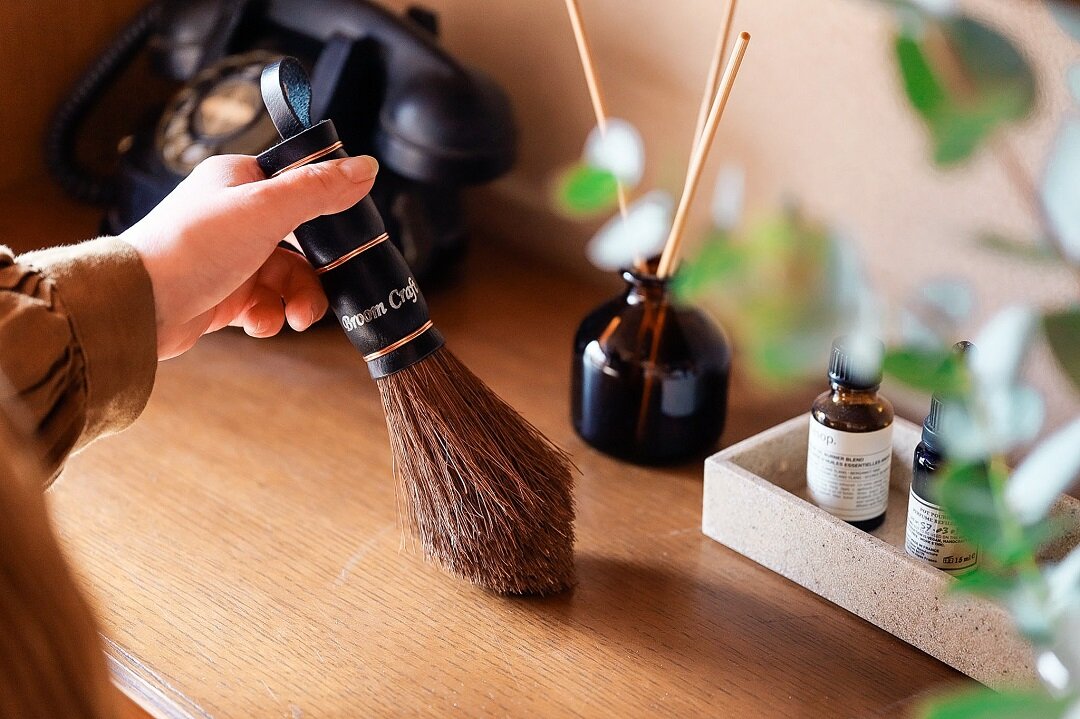 この手帚の最大の利点は「出す」という動作が不要なことが挙げられる。 棚の横やデスクの端に掛けておけて、インテリアにも馴染んでくれる美しいデザイン。これまでの掃除道具はプラスチック製であったり、しまっておきたい、隠しておきたいものであるのとは大きく異なる点だ。