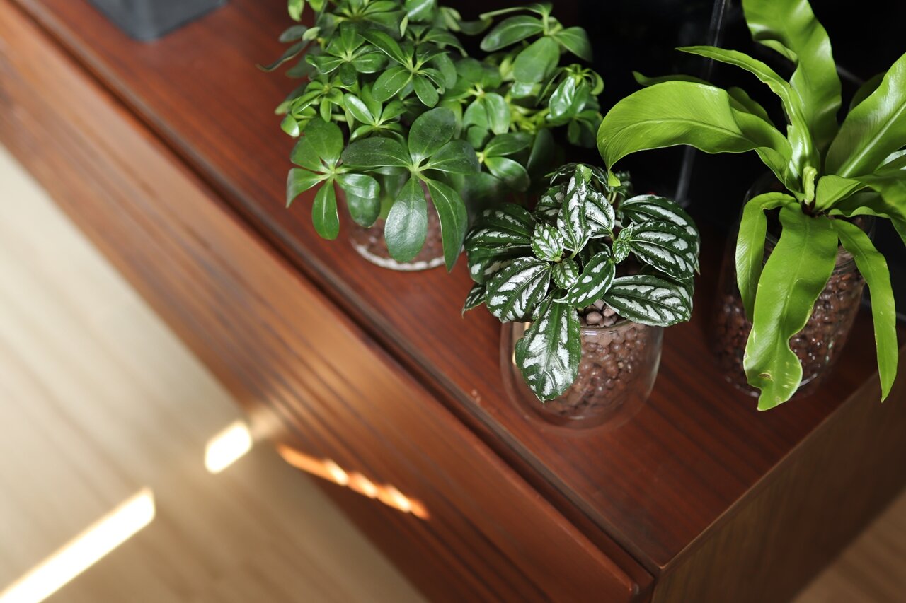 ガラス容器の抜け感は植木鉢の存在感を軽くしてくれる