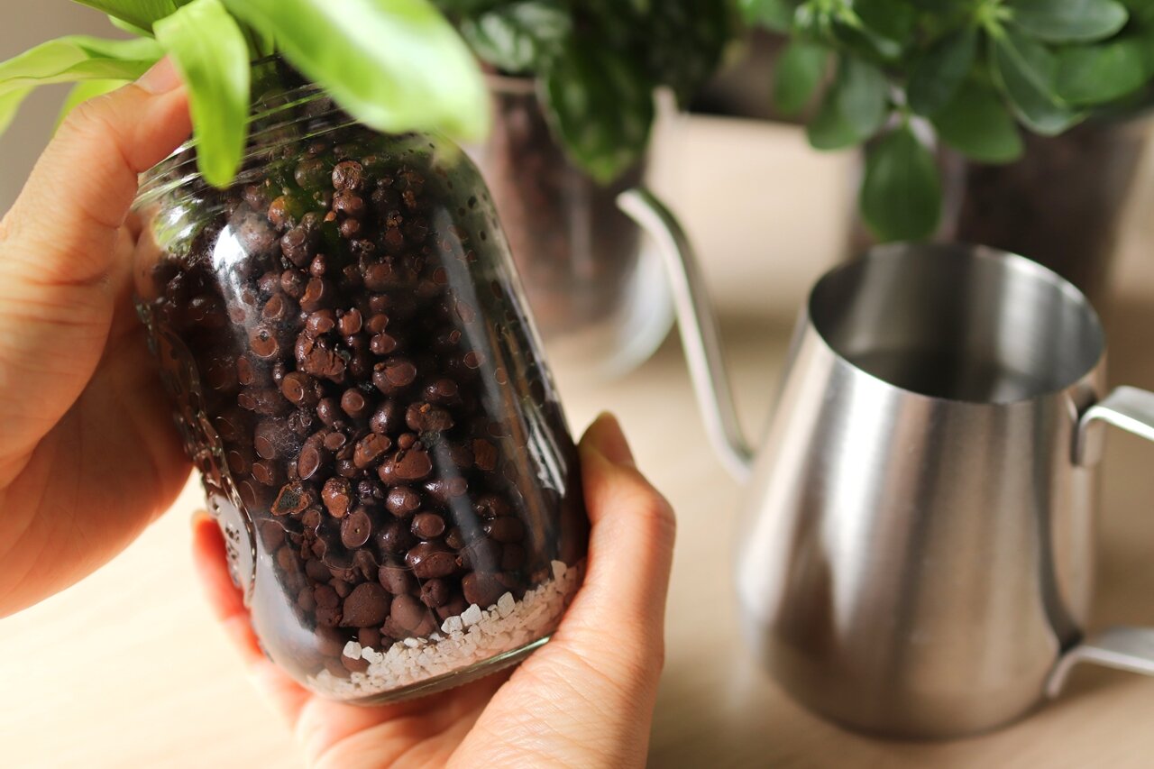 植物を栽培するときの失敗で多いのが水の与えすぎだといわれている。土に植えていると、水やりのタイミングがわかりにくいからだ。しかし、ガラス容器のハイドロカルチャーは水の残量が見えるため、水の与え時がはっきりとわかる。容器に溜まった水がなくなったら、全体の5分の1程度まで水やりすればOKだ。