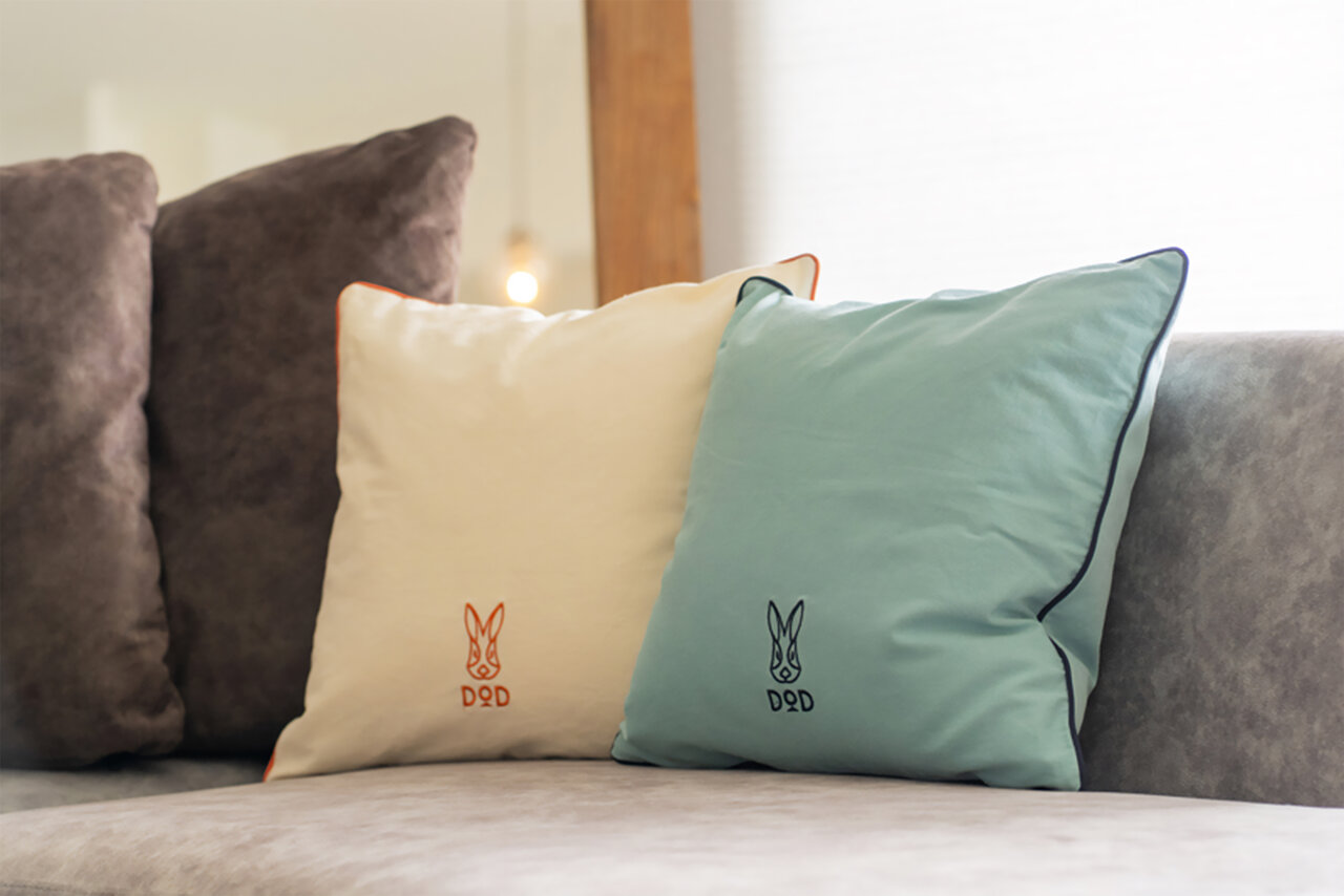 2種類がセットになったクッションカバー。縁の差し色がほどよいアクセントとなり、リビングを明るい印象にしてくれる