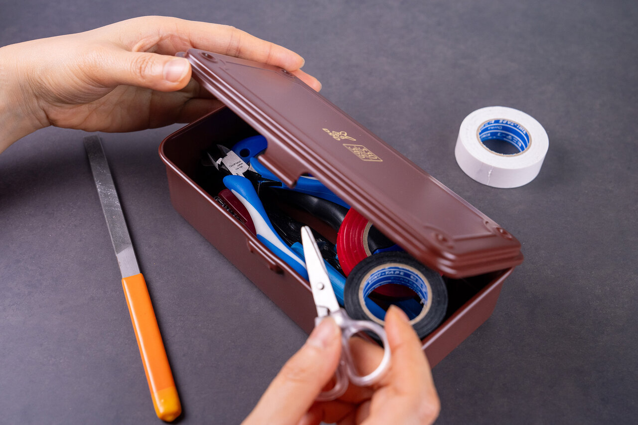 ツールボックスは、工具入れとして活躍中だ。たまにしか使わない小物は収納場所に困りがちだ。デスクの上に置いたままでも様になるので、限られた収納スペースを使わずに済む。複数個買えば、ぴったりとはまり積み重ねられる仕様になっているのもポイントだ。